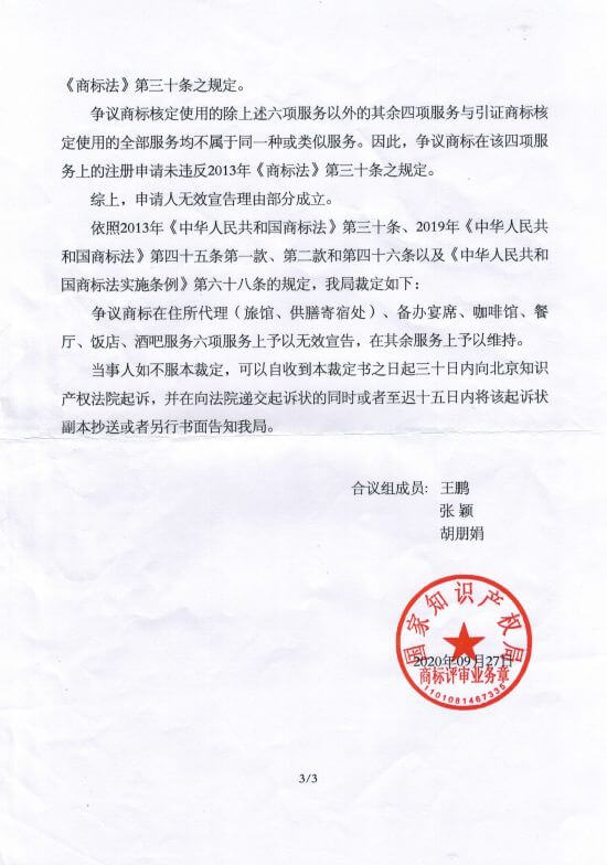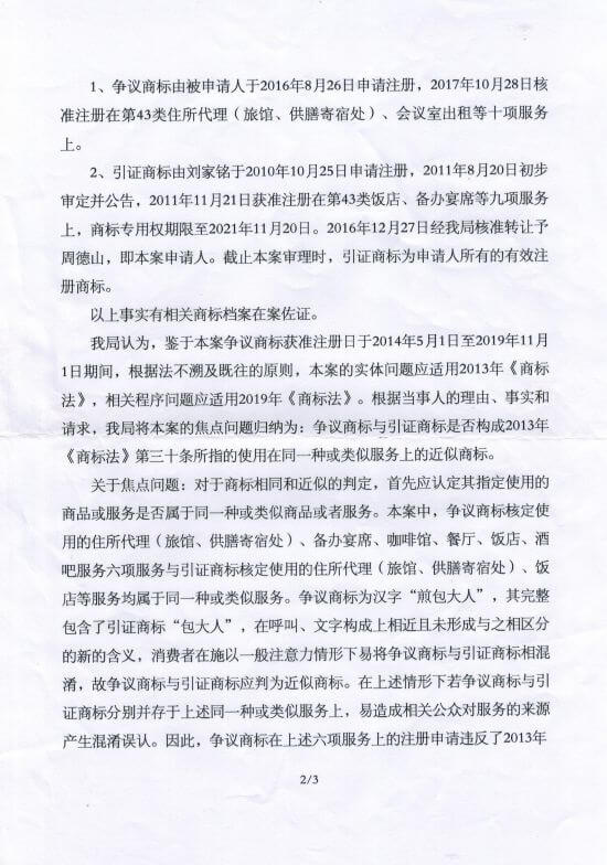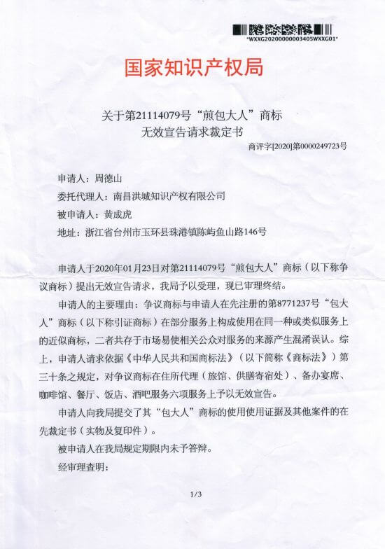 主要理由:争议商标第21114079号煎包大人与在先注册的引证商标第8771237号包大人在餐饮服务上构成使用在同一种或类似服务上的近似商标,二者共存于市场易使相关公众对服务的来源产生混淆误认,其核准注册违反商标法第三十条规定。